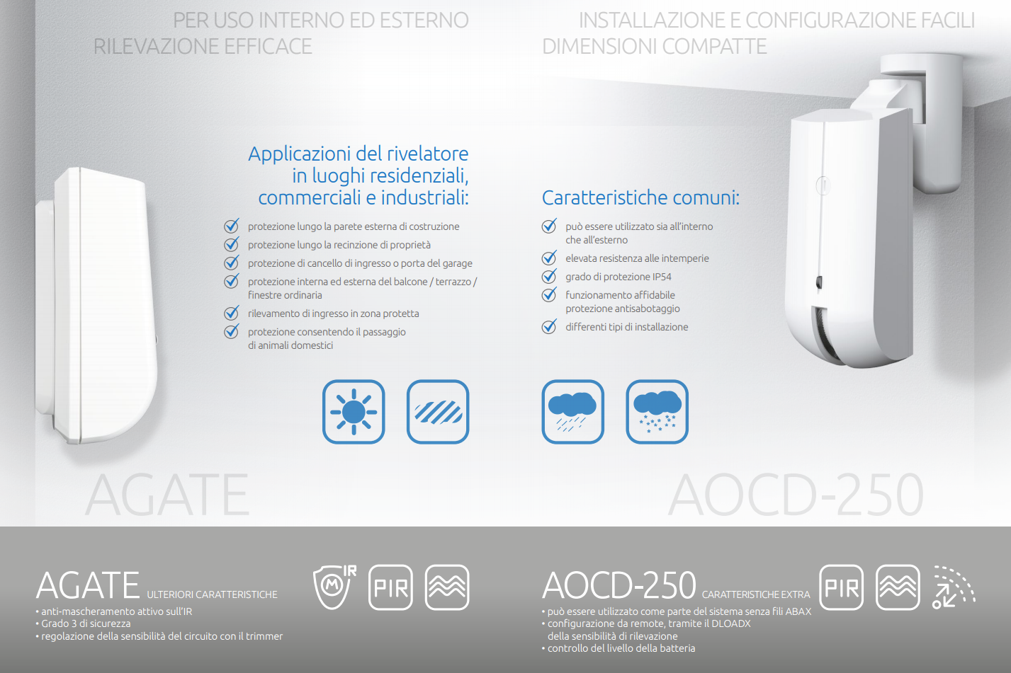 I rivelatori AGATE garantiscono un’ottima protezione perimetrale per qualsiasi edificio ma possono essere utilizzati anche per la protezione interna negli impianti, dove le condizioni ambientali difficili o speciali prevalgono (ad es. capannoni, sotto le tettoie). Per rilevare il movimento, AGATE utilizza due canali, ad infrarossi e a microonde, la cui sensibilità può essere controllata in modo indipendente. AGATE è dotato di una funzione anti-mascheramento IR attiva soddisfacendo i requisiti dello standard EN 50131-2-4 Grado 3. Pertanto, il sensore può essere utilizzato per proteggere i locali ad alto rischio di furto che richiedono un elevato grado di protezione, tipo gioiellerie e gli interni di edifici pubblici.