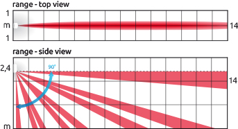 Il rivelatore a tenda AGATE ha un angolo do rilevazione di 10 gradi e un raggio di azione di 14 m. A quella distanza, il fascio emesso ha una larghezza di circa 1 m. La regolazione della sensibilità dei canali di rilevazione si imposta con i due trimmer indipendenti sulla scheda del dispositivo.
