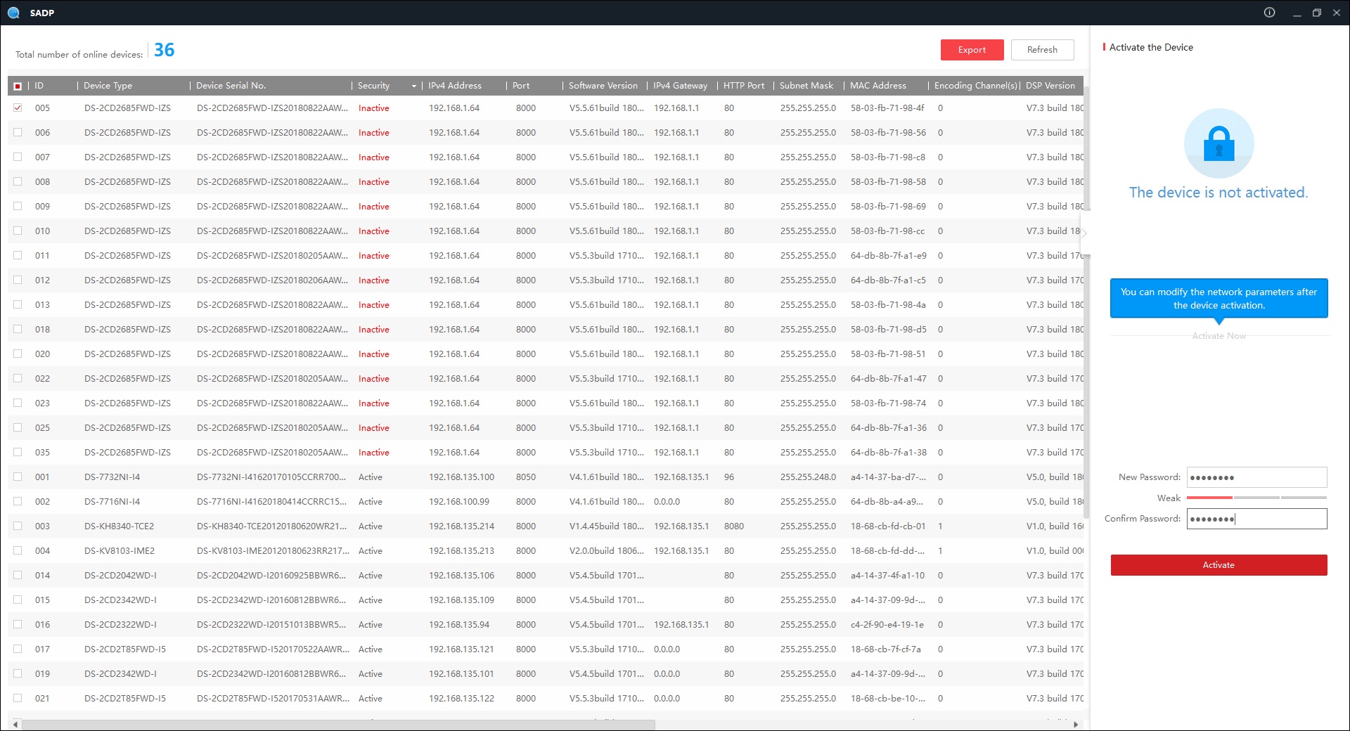 3. Una volta avviato, il software SADP Tool riconosce automaticamente tutti i dispositivi HIKVISION presenti sulla stessa rete fisica del PC (compressi DVR, NVR, Telecamere IP). La colonna Security mostrerà lo stato del dispositivo e noterai lo stato Inactive nella riga corrispondente al dispositivo.